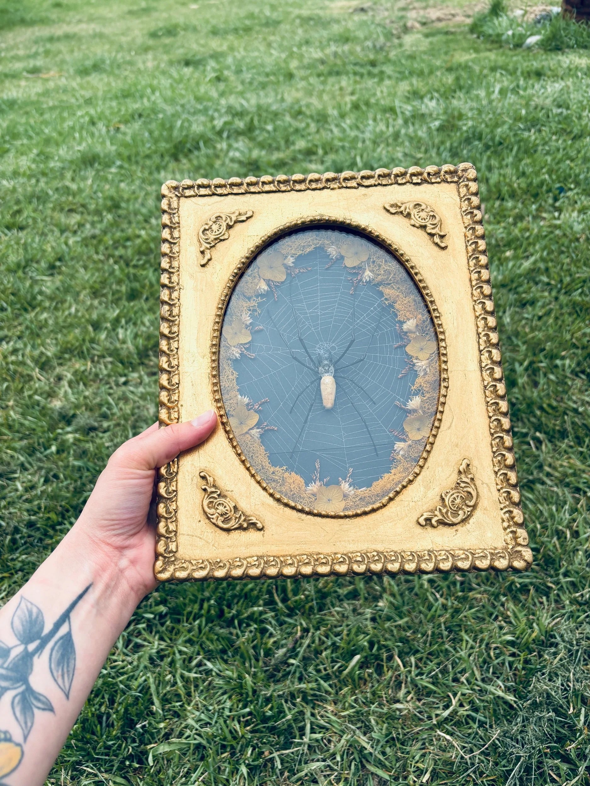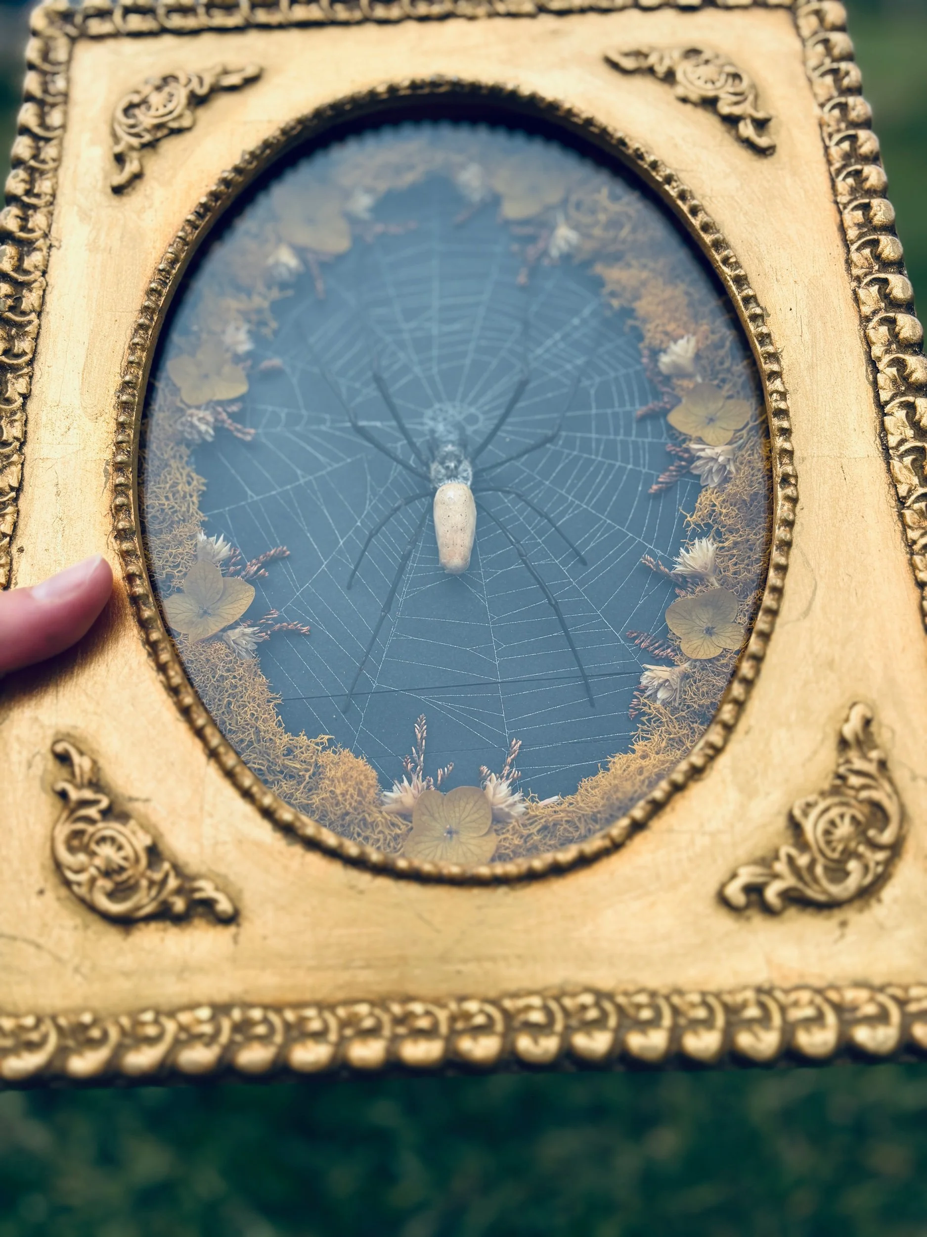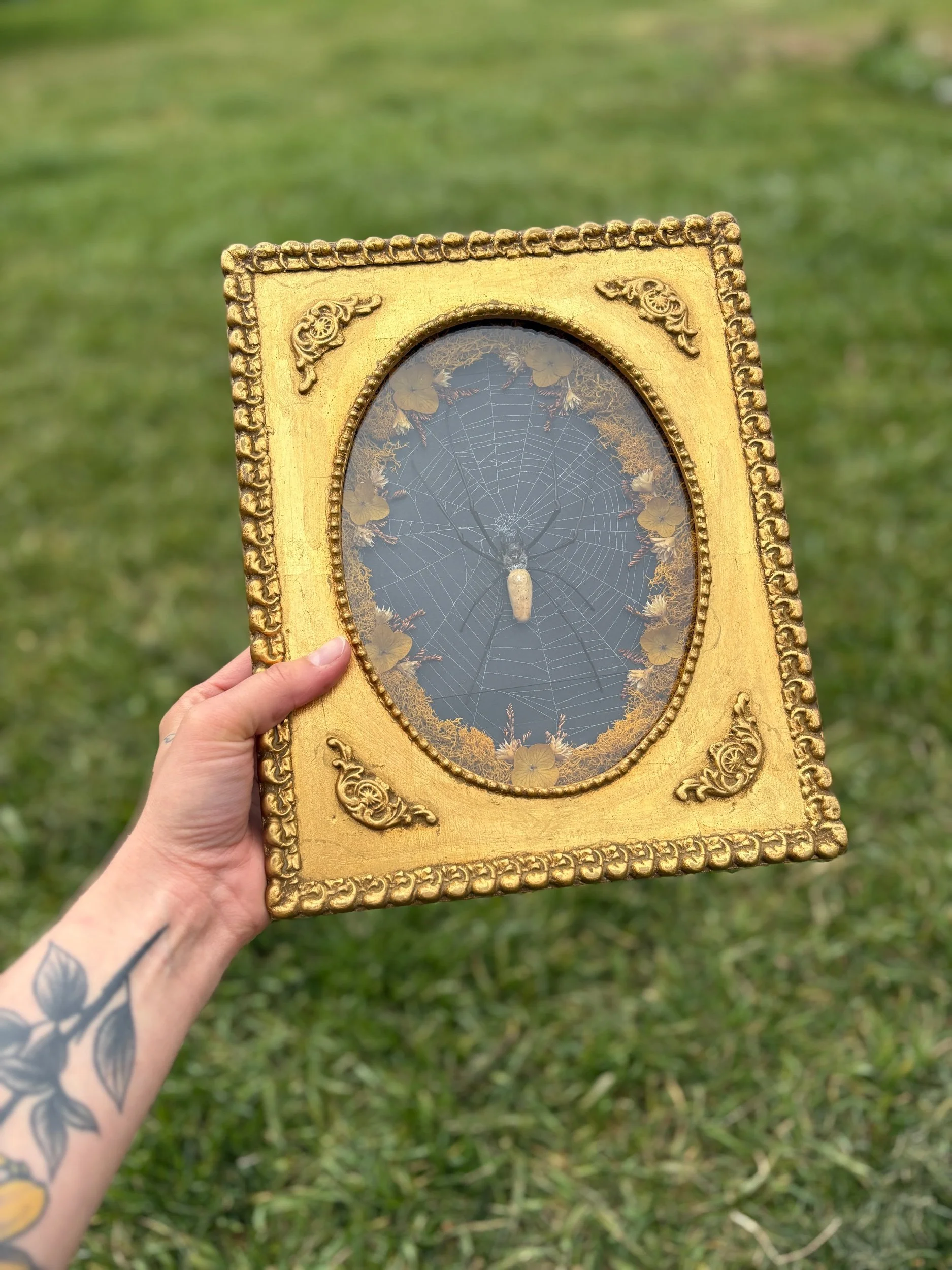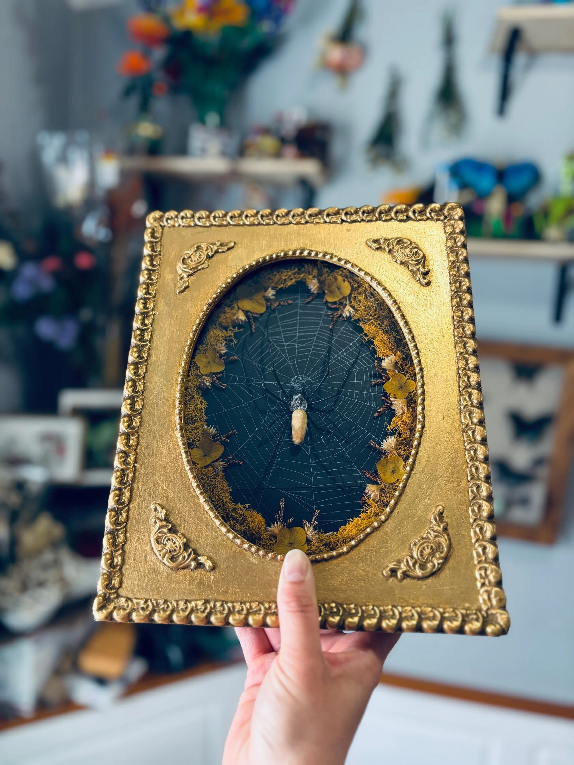 Orb weaver with tigers eye moss and florals on a real preserved spiderweb backdrop in an antique golden frame