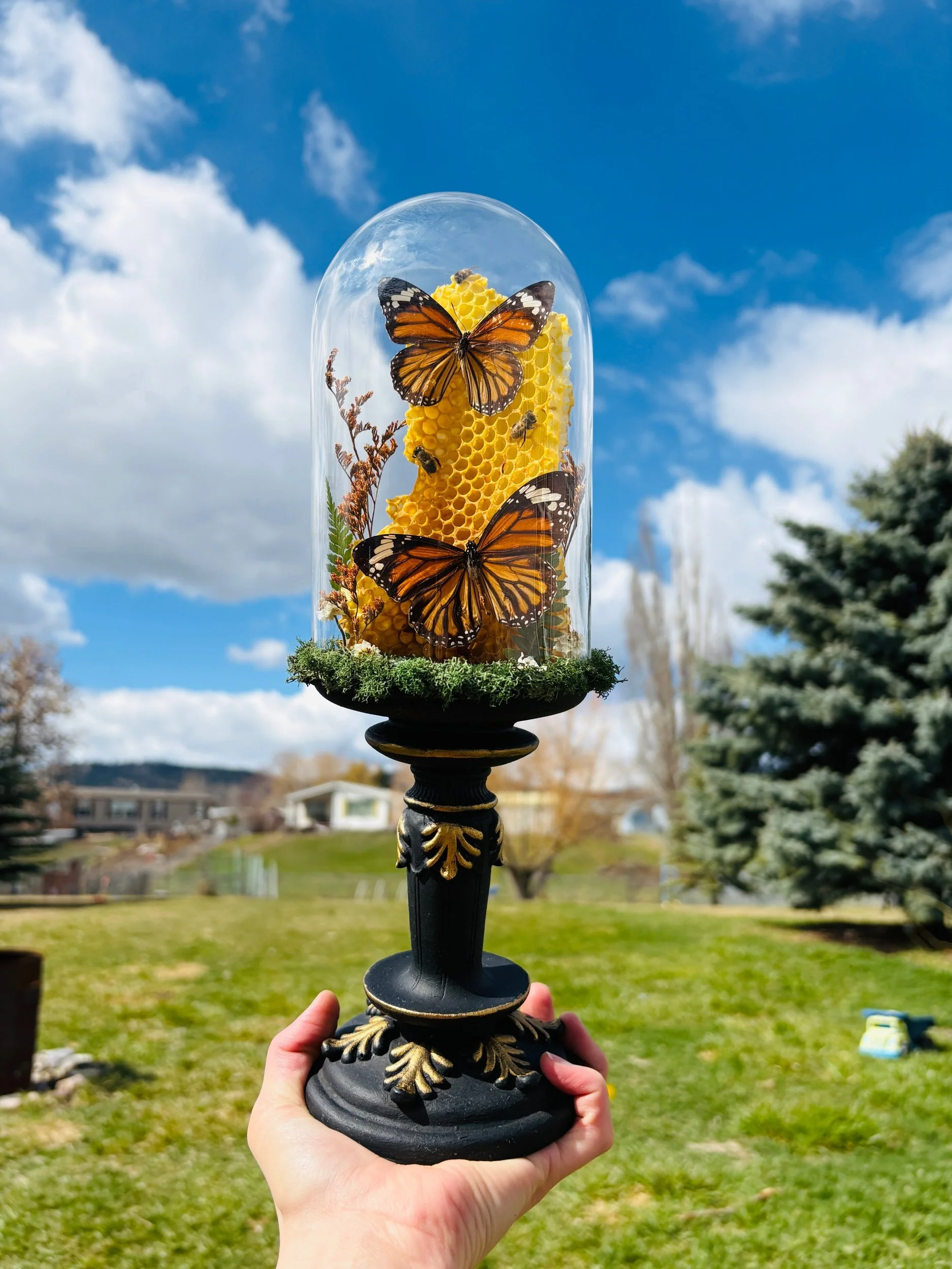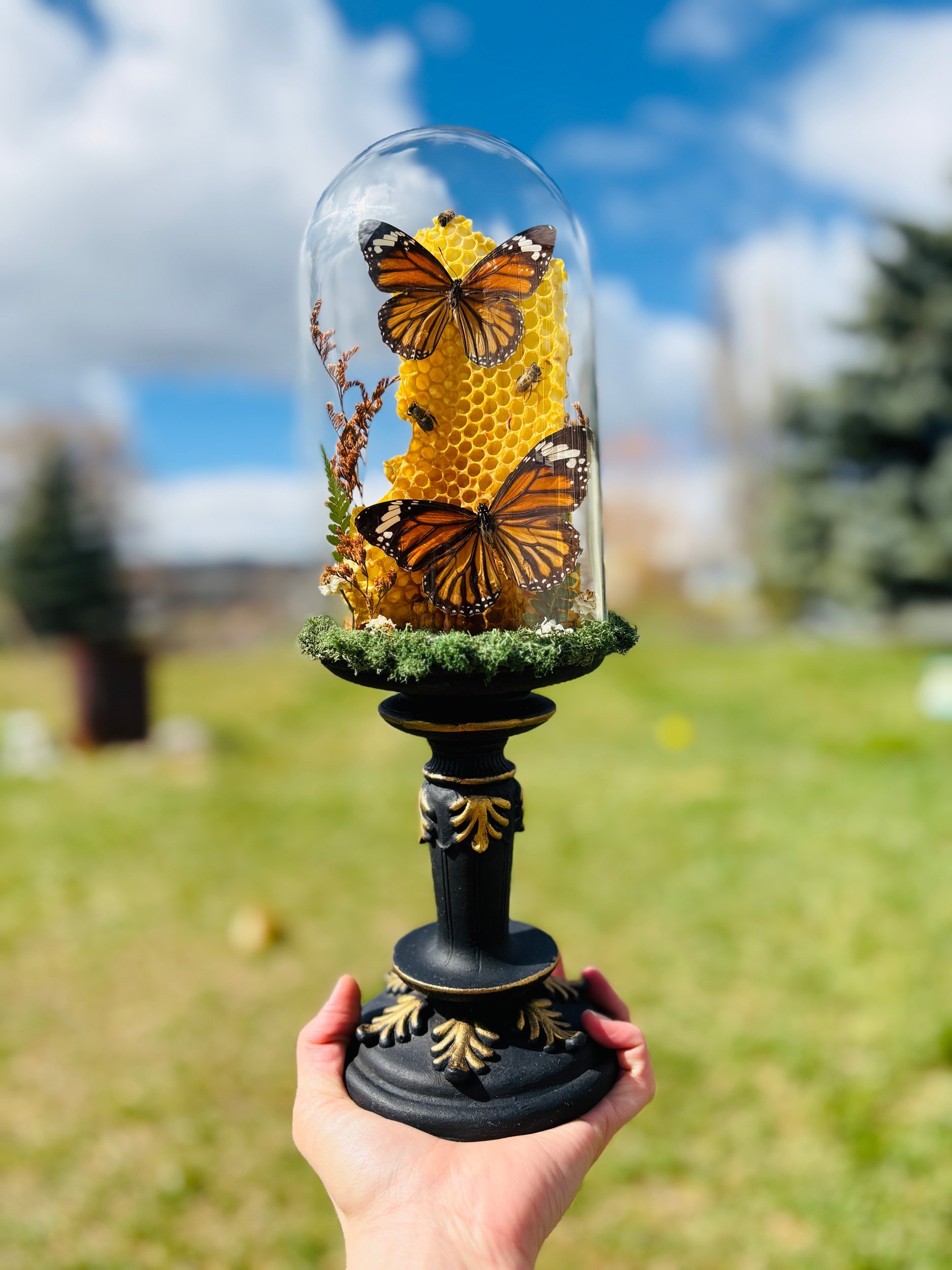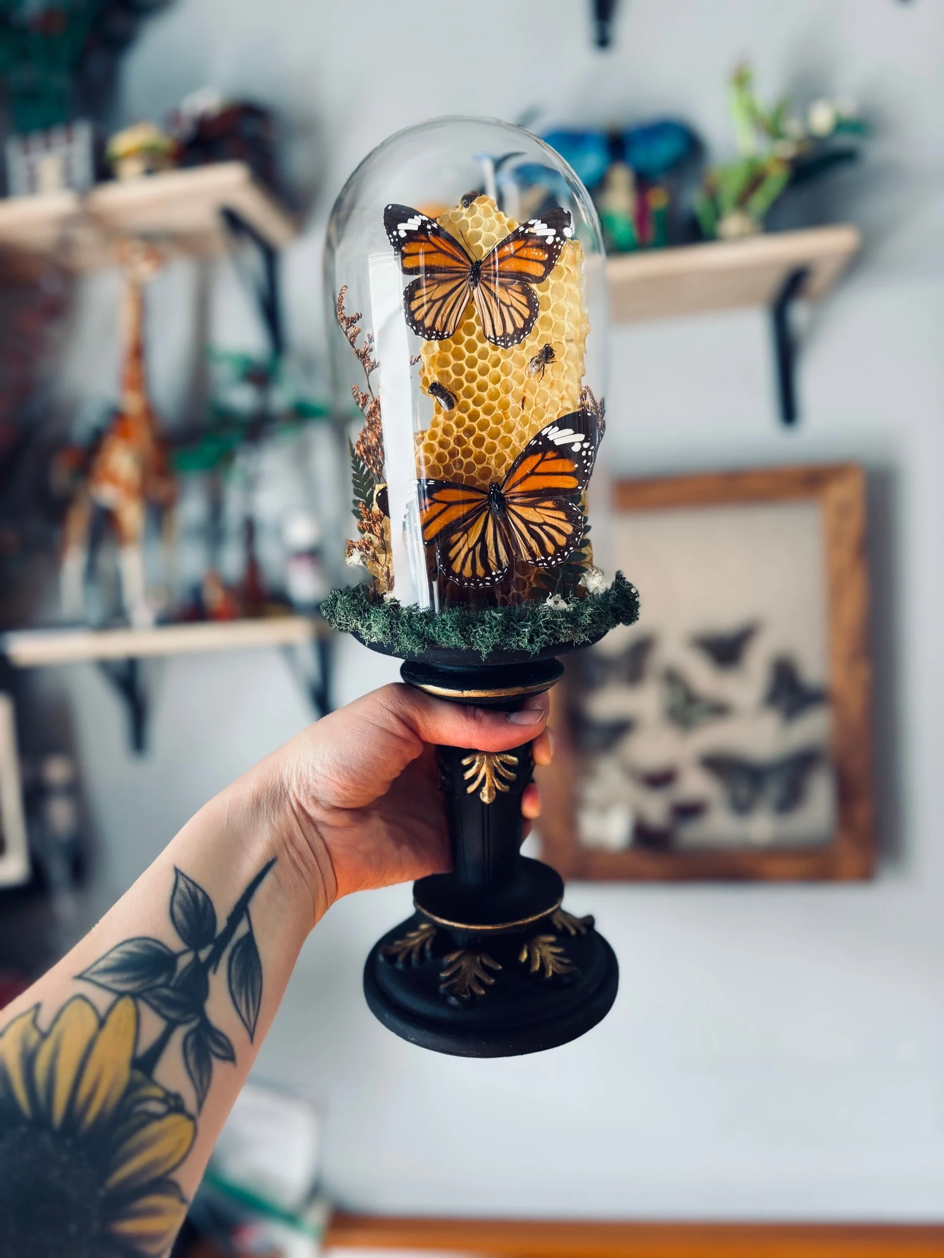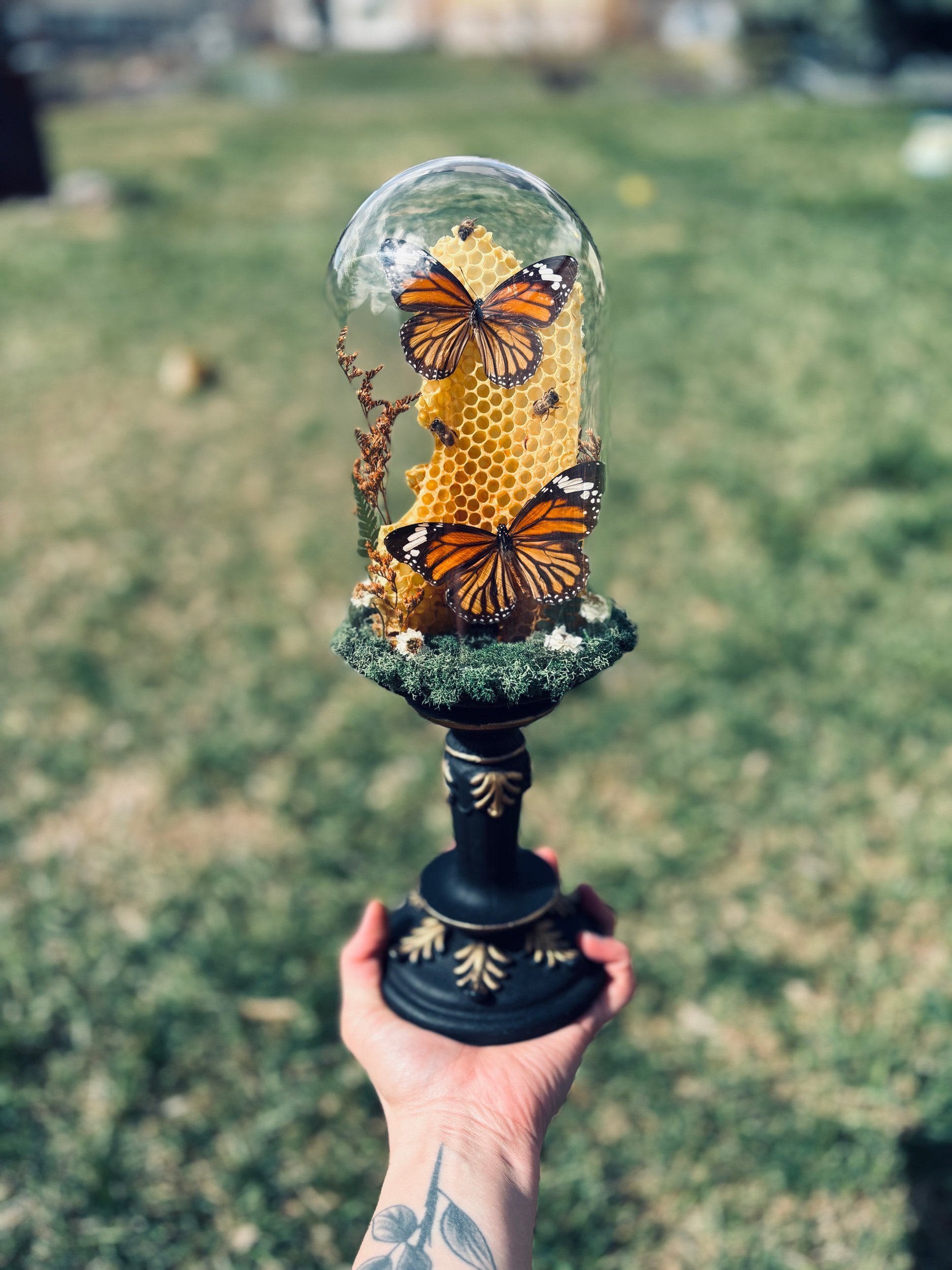two monarch butterflies with honeycomb, honeybees, dried moss and florals in a dome with a black and golden base