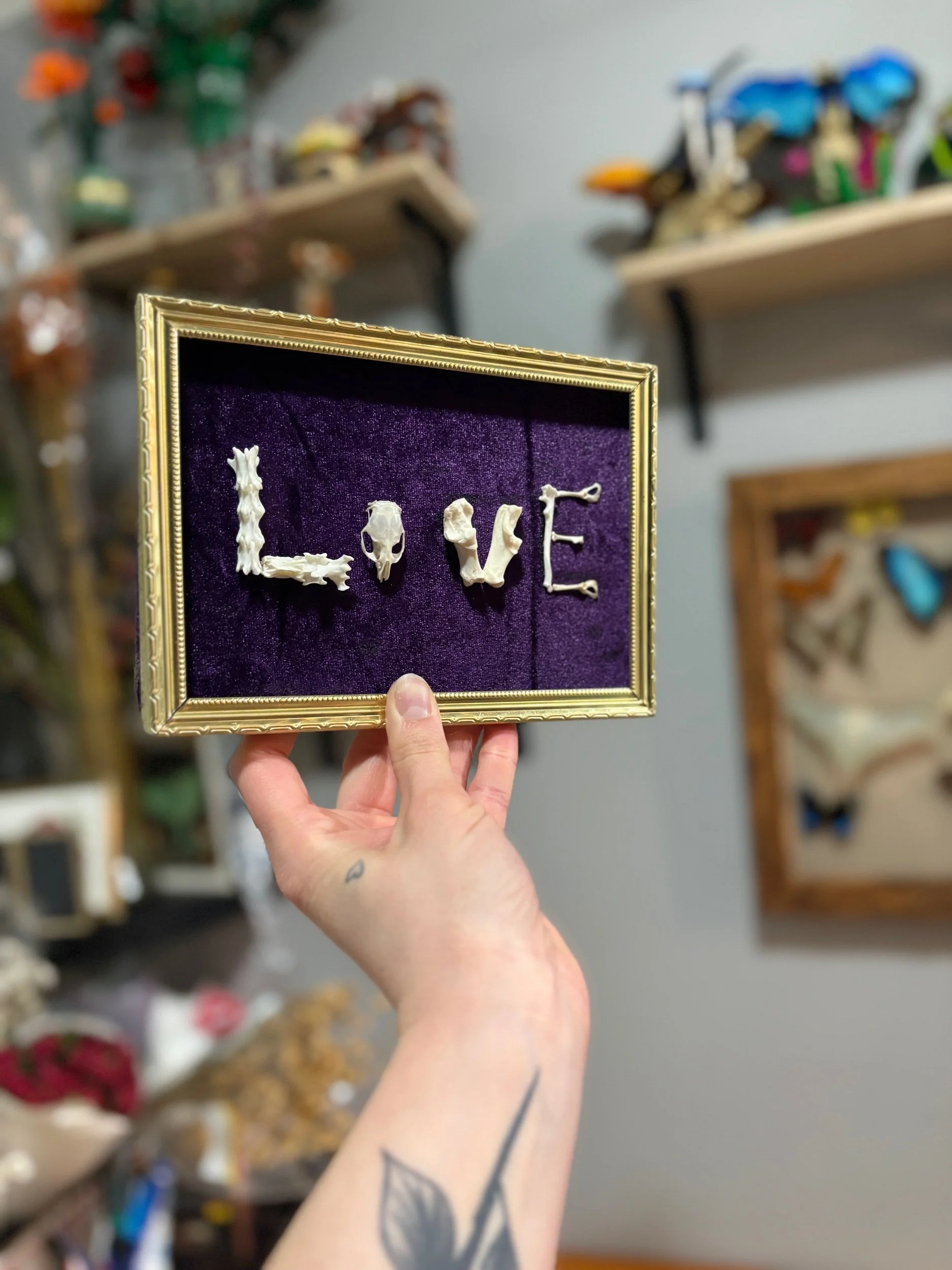 “Love” spelt in bones in a golden frame with a deep purple velvet backdrop