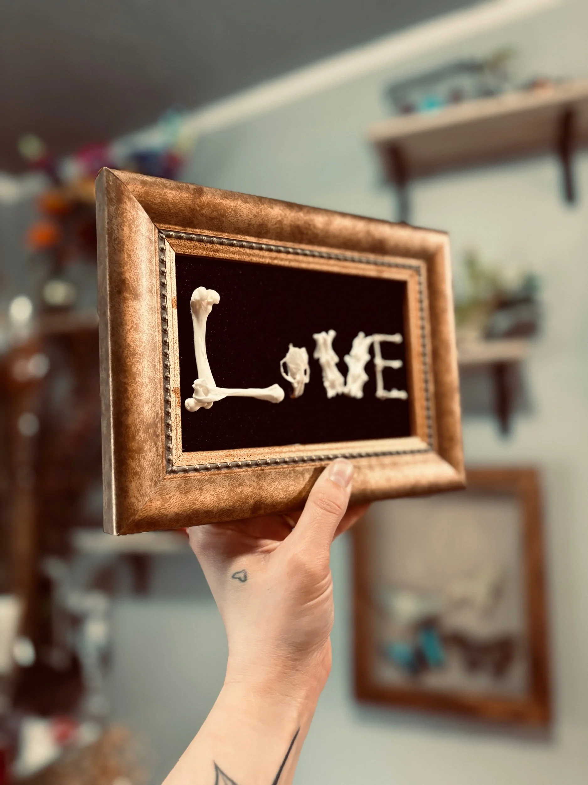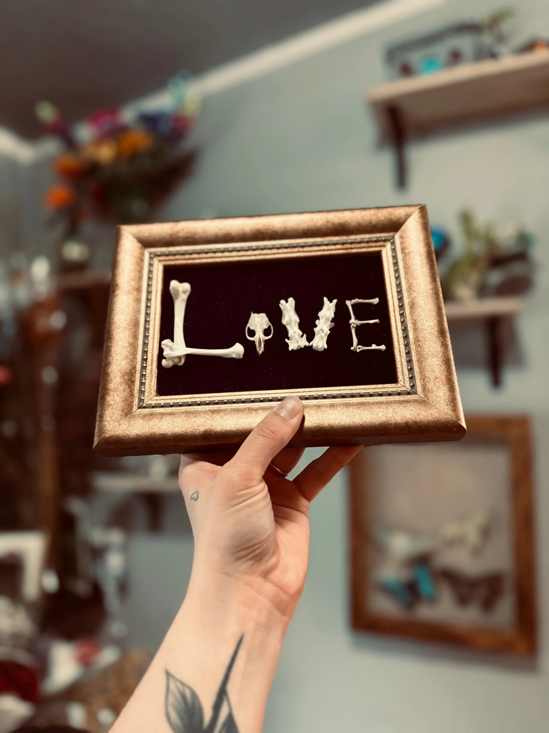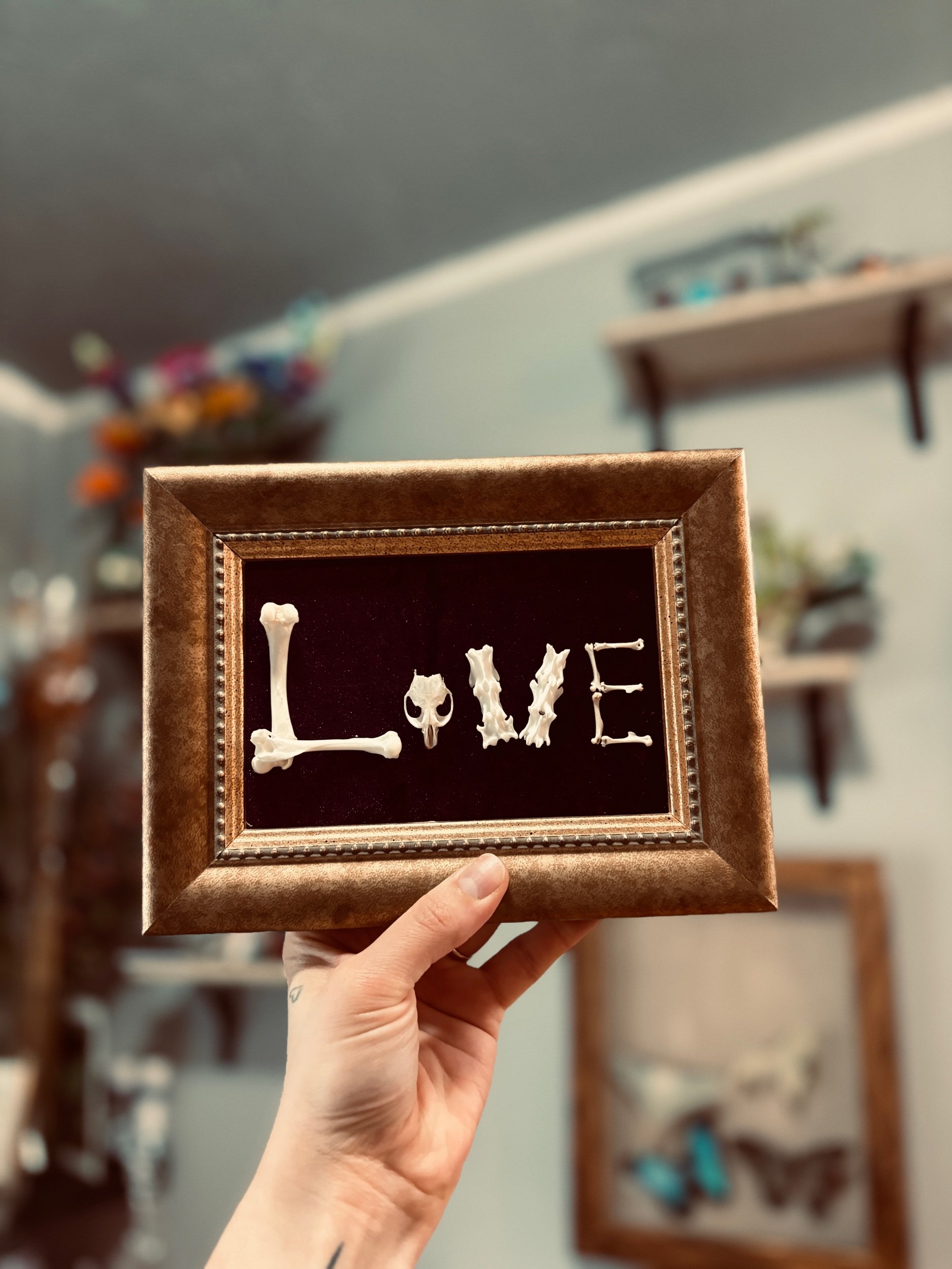 “Love” in bones on deep purple backdrop in a golden ornate style frame