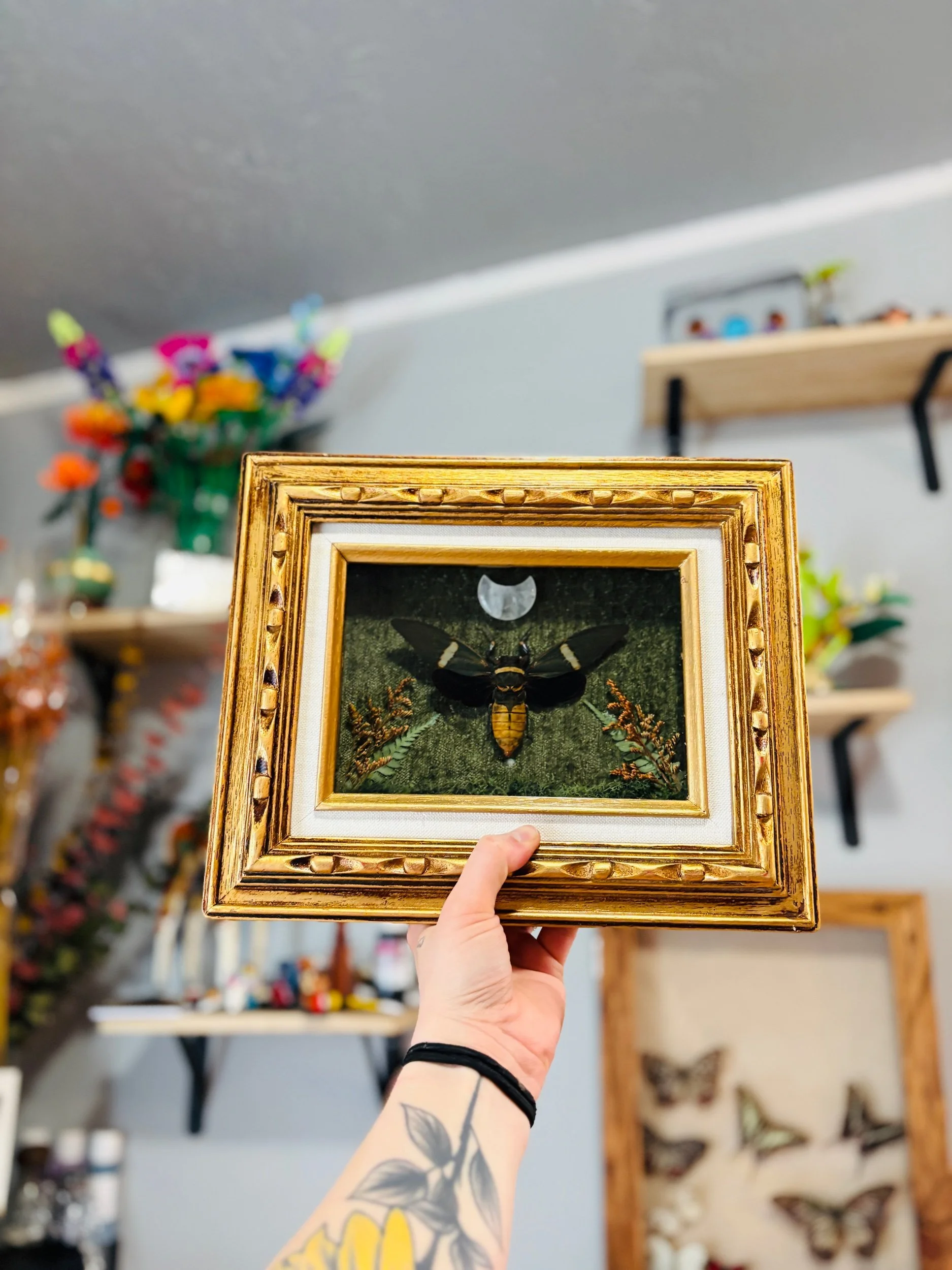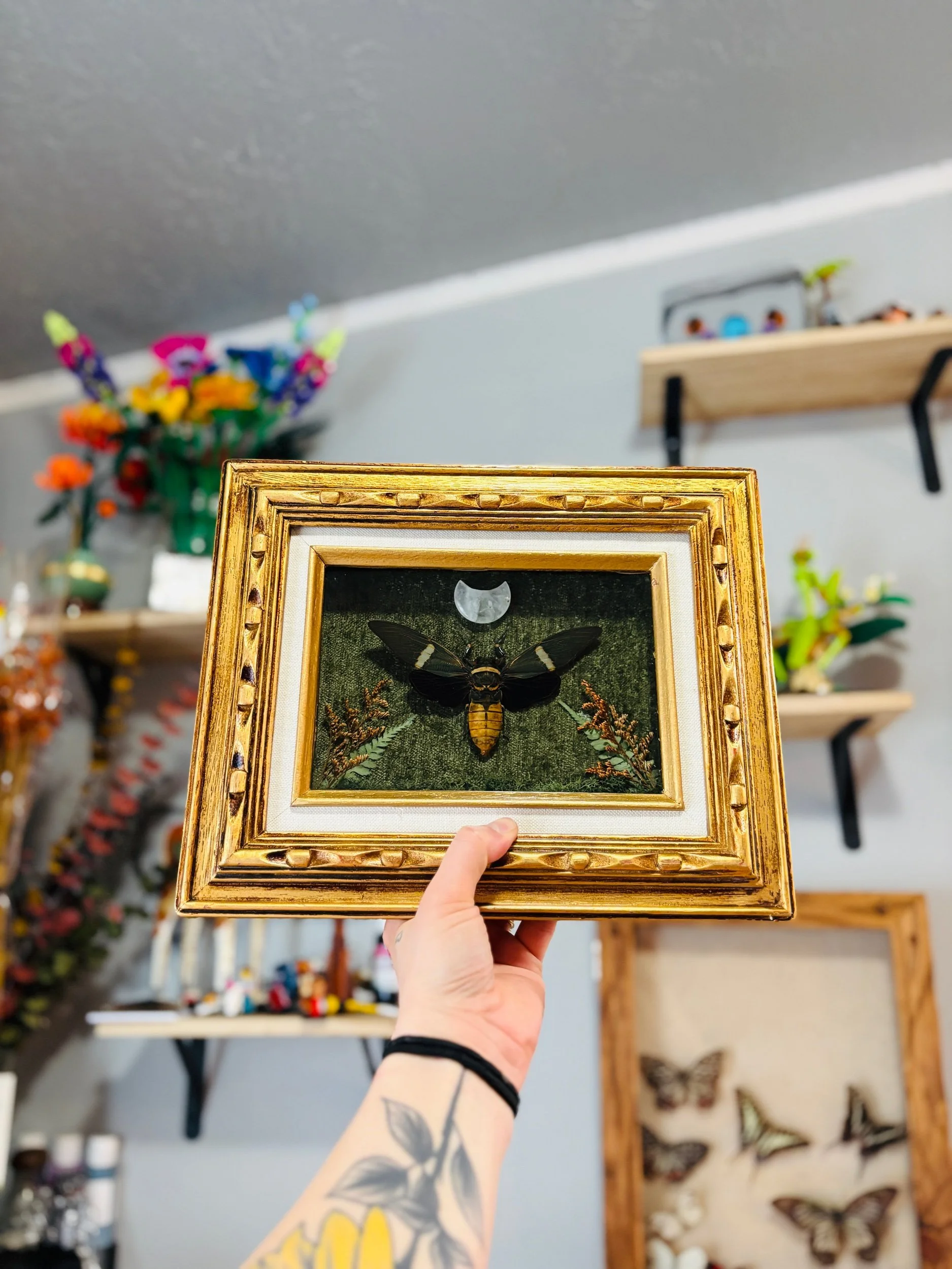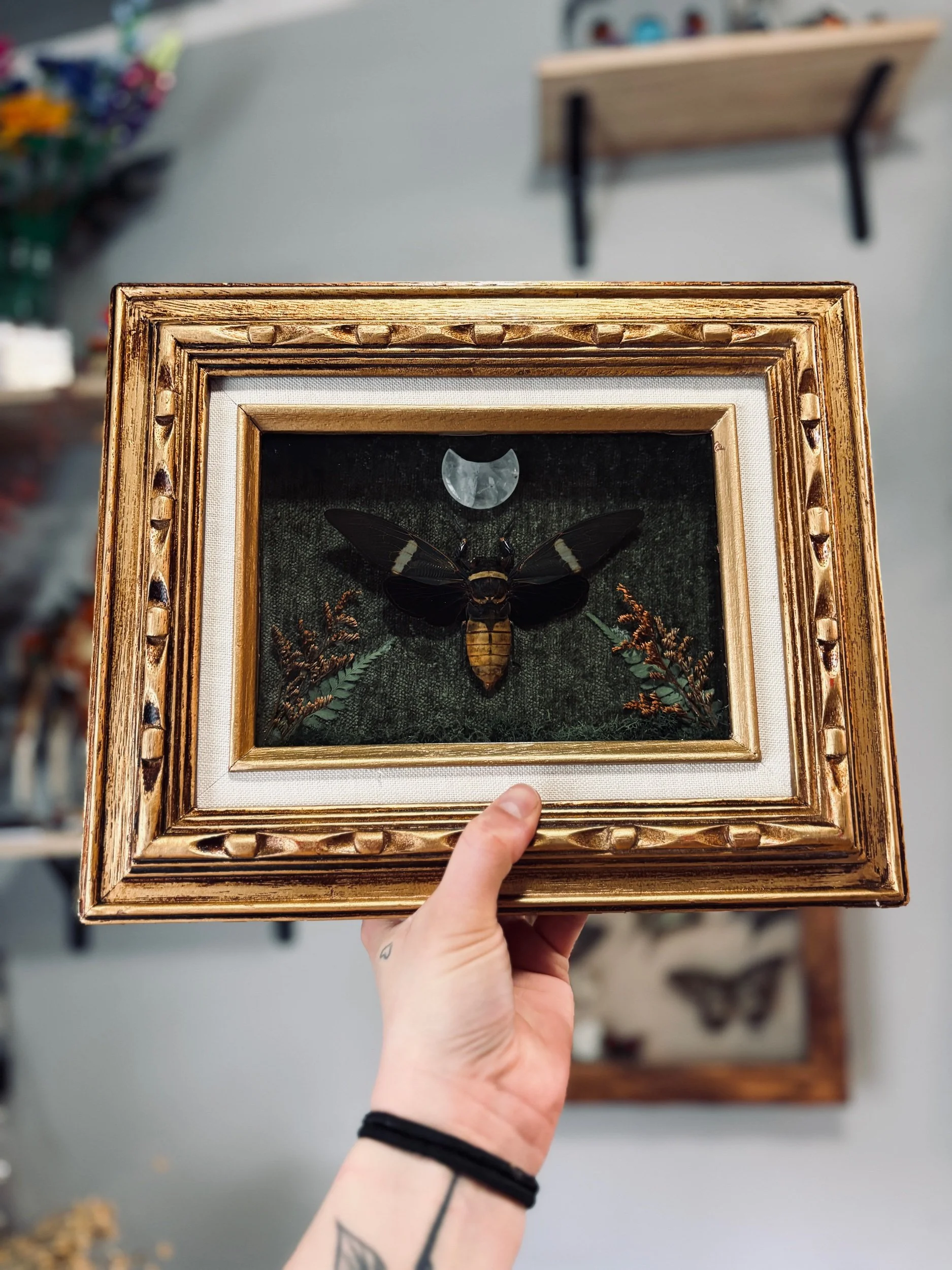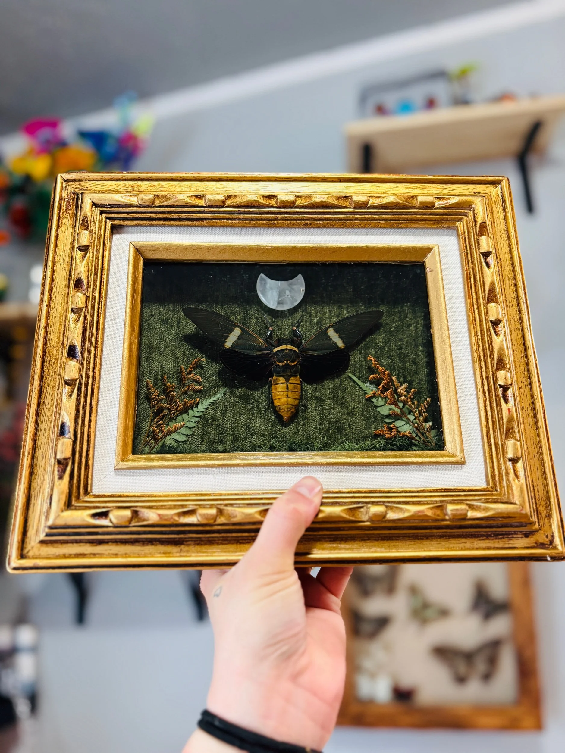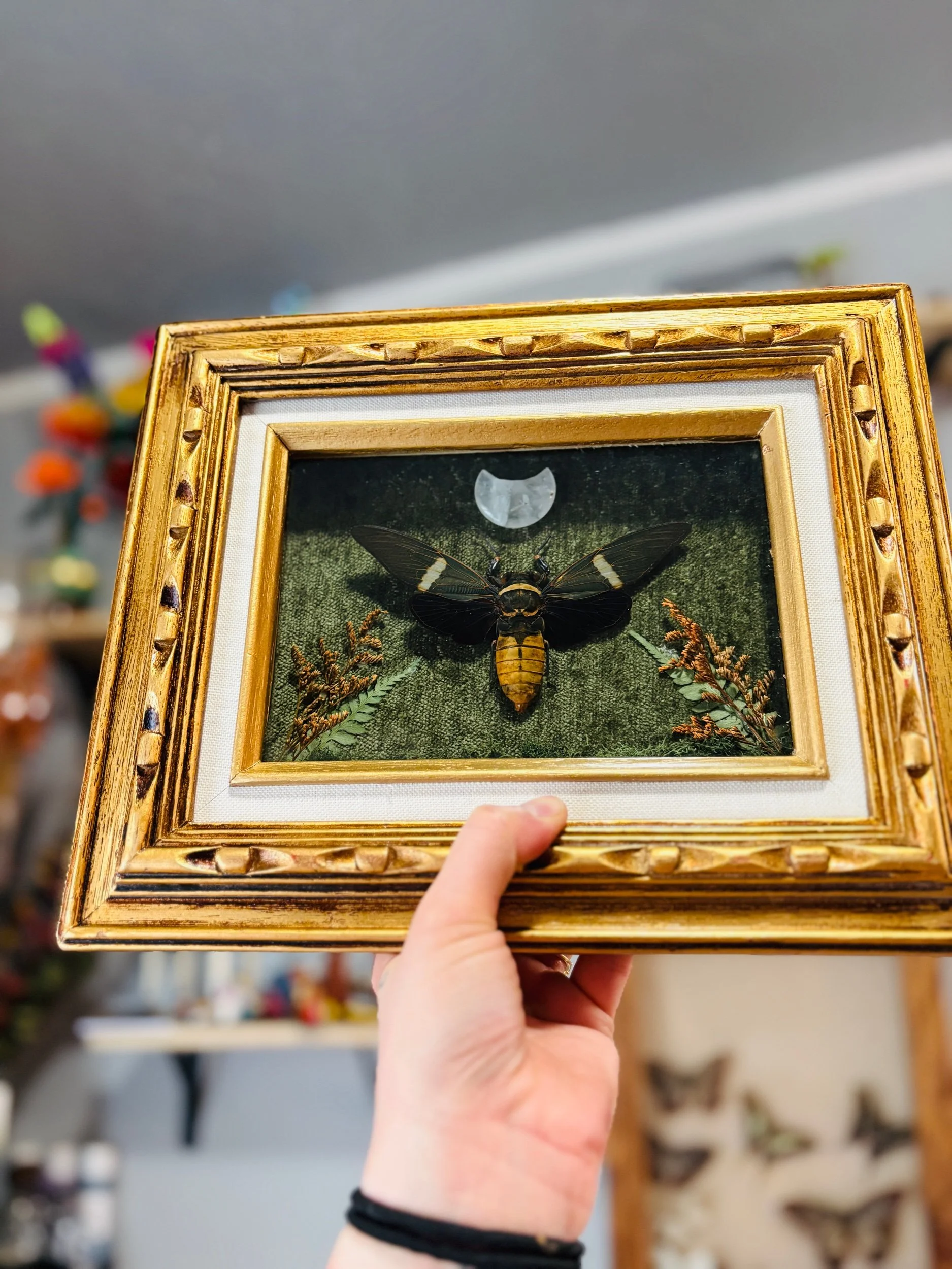 Cicada on a green velvet backdrop with dried floral and leaves with a crystal crescent moon in an antique style golden frame