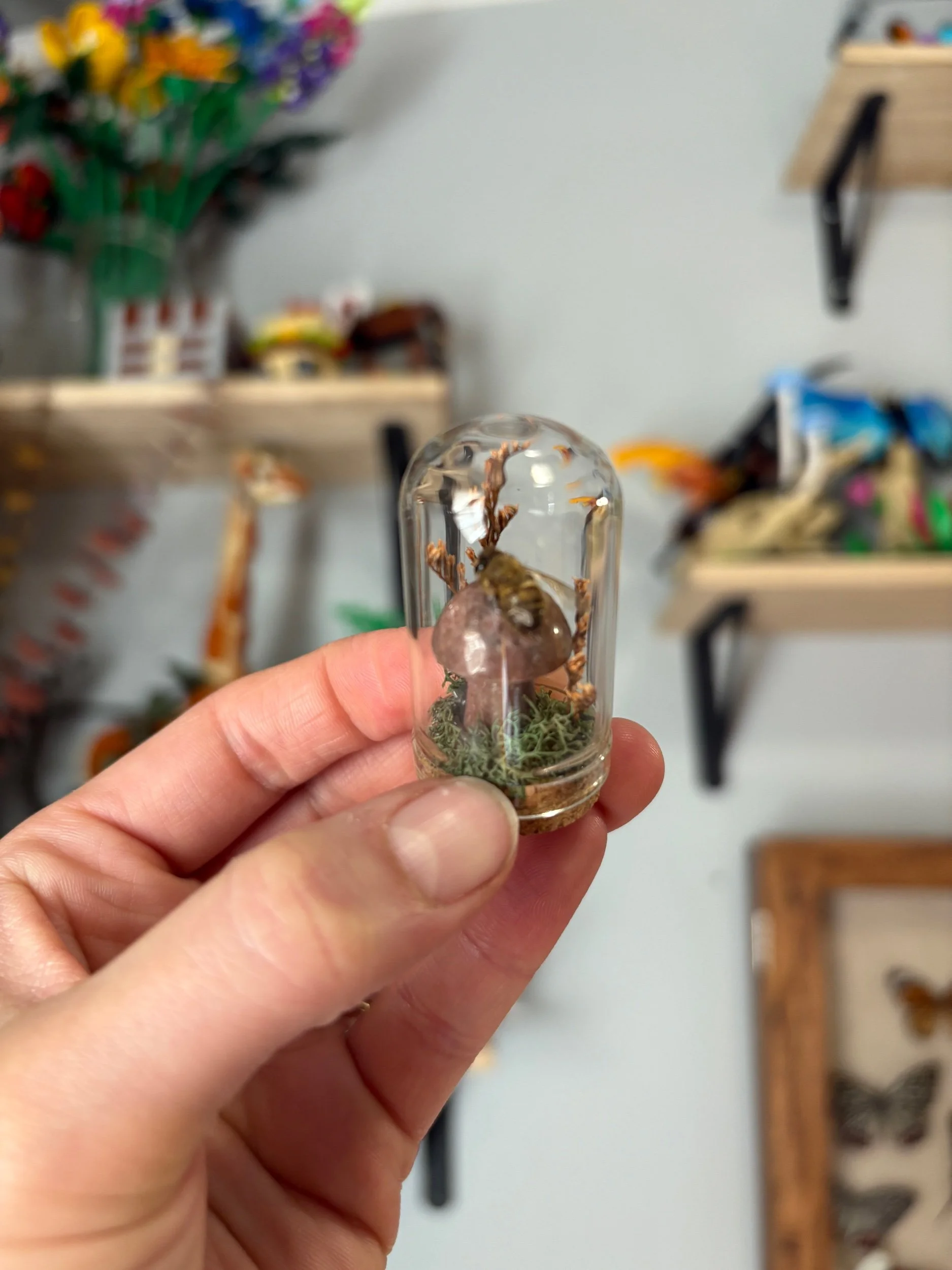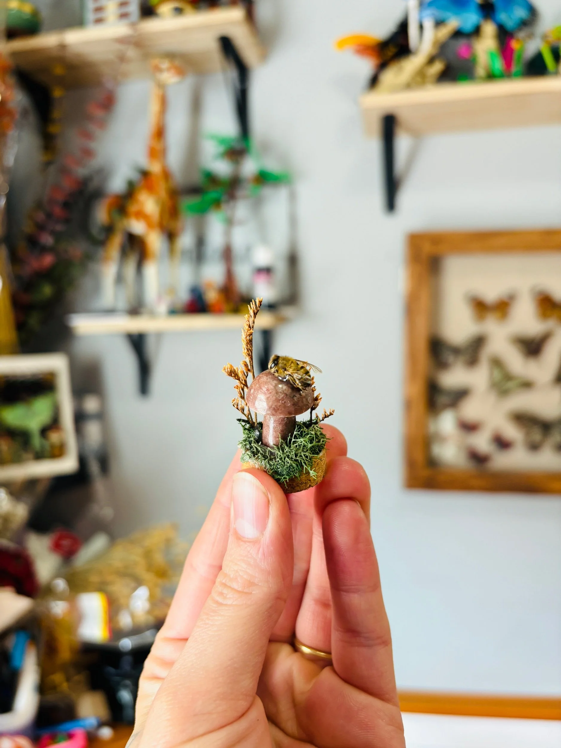 FRAMES AND DOMES › Honeybee mini dome Image 1 of 3 Image 2 of 3 Image 3 of 3 Honeybee mini dome $15.00 Honeybee with a crystal mushroom with dried florals and moss Add To Cart Added! Honeybee with a crystal mushroom with dried florals and moss